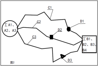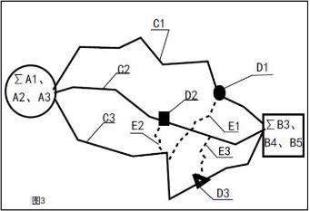要指出的是:图3中所述的新设传质通道E1、E2、E3,是要经过下位的更进一步的研发论证工作才能具体地建立起来;理论上讲,在图2所述的C1至C3之间能设置出无穷多条传质通道Ey→∞;路径模型的图1最简图形的Ⅱ级展开,即是将普通方框图链按其Ⅰ级展开的节点衔接关系予以绘出。