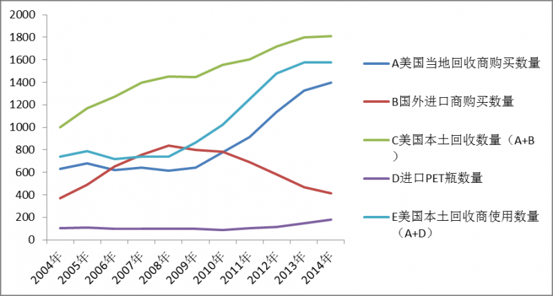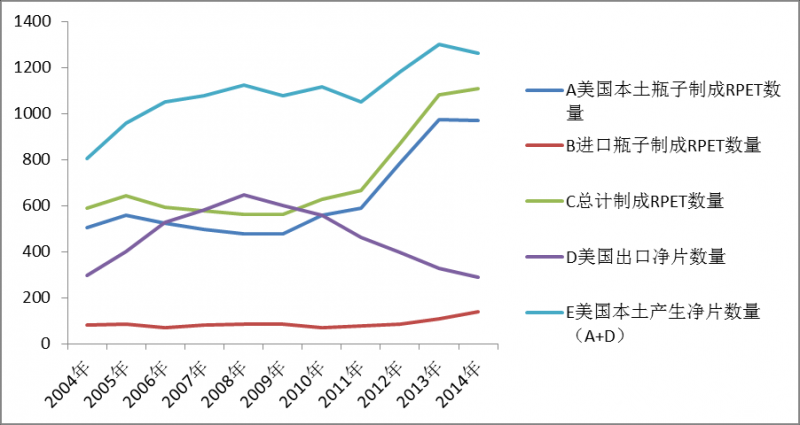 按重量计,美国在2014年收集到18.12亿磅的消费后PET瓶比2013年高了1400万磅,其中13.98亿磅是由美国当地回收公司购买。另外4.04亿磅被出口到国外,剩余1000万磅PET瓶组件被混合打包出口。