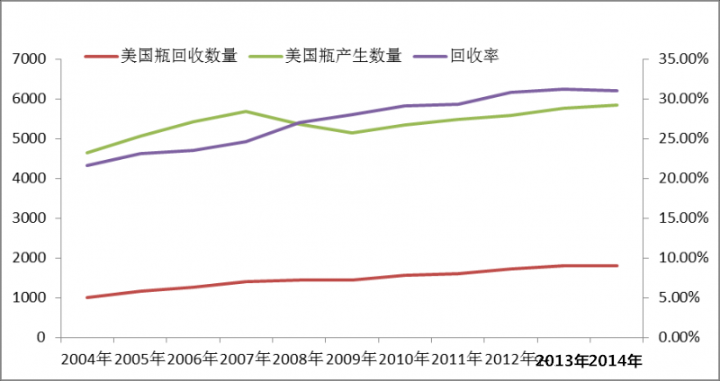 2004-2014年美国瓶回收率对比表(单位:磅)