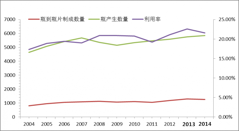 2004-2014消费后PET瓶回收和使用数量年度对比表(单位:磅)