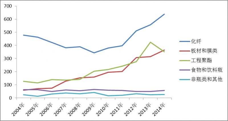 2004-2014年美国回收PET瓶片应用行业数量对比表(单位:磅)