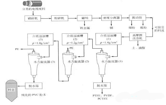 这个过程的特点是为了使回收PVC无污染,采用高速洗涤3种密度溶液的密度分选及熔融过滤和干燥;熔融过滤以达到无杂质。