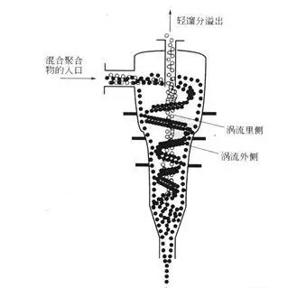 产品流被输送到高摩擦的清洗设备中,经过该过程塑料中不含有切断阶段未分离出的铜线。然后将材料放人含有密度分离介质的槽中,槽中的介质由密度为1.40g/cm3的盐的水溶液组成。粉末和分离介质被泵打人一系列水力旋流器中。这些水力旋流器的操作原理如下图所示。塑料粉末粒子悬浮在分离介质中,而重的杂质如残余金属则下沉。