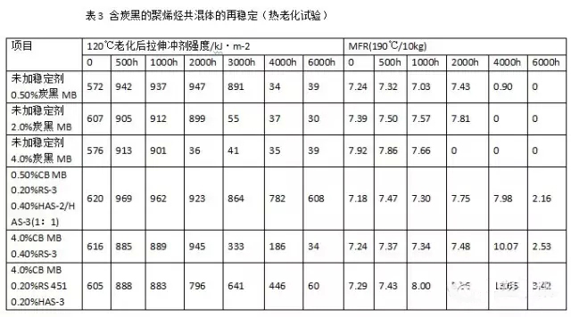 如果添加一种酚类抗氧剂( AO-18 )、亚磷酸酚( PS-2)和聚合物HAS ( HAS-3 )组成的复合稳定剂,110℃耐热老化稳定性能可提高到97d。